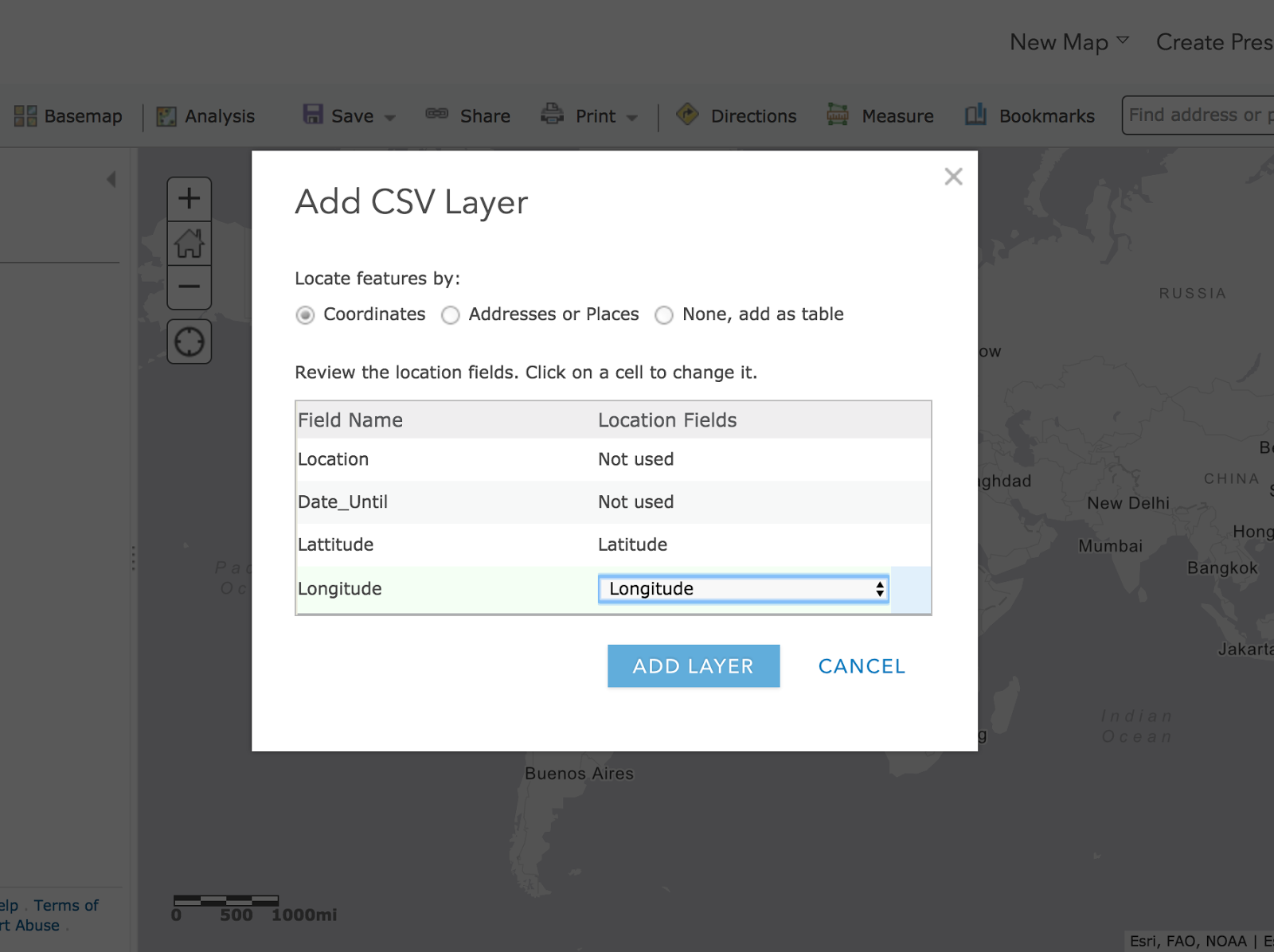 Now, you need to specify which fields in your spreadsheet are the lat/long coordinates. In the new window, make sure the “Locate features by” prompt is set to “Coordinates.” Below it, you will see a list of all the columns from your spreadsheet. Click the text that is directly to the right of “Latitude” (or whatever you named the latitude column), and you should see a dropdown list. Select “Latitude.” Do the same for “Longitude.” Click “Add Layer.”