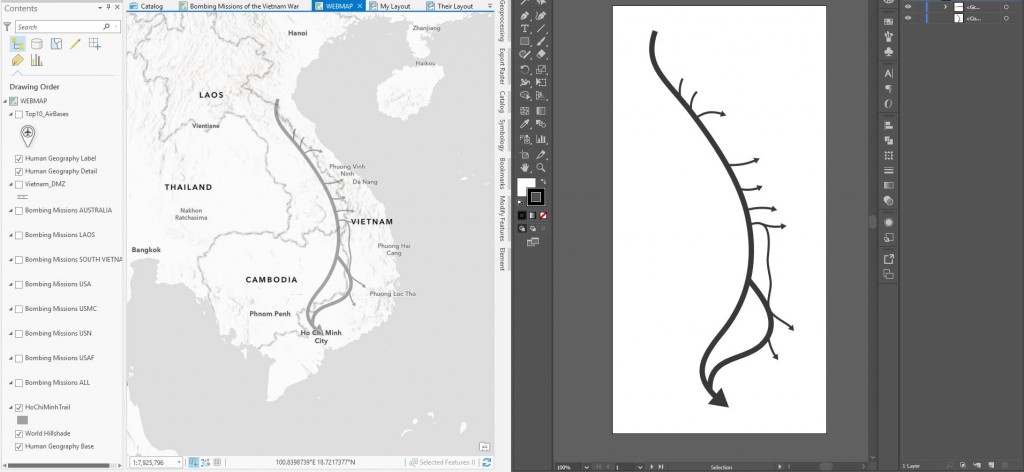To recreate the Ho Chi Minh Trail, I traced a creative commons map of the route in Adobe Illustrator. I then exported the vector shape as a CAD file, and brought it into Pro. Since the CAD file had now spatial information, I manually resized and georeferenced it, and exported it as a GDB feature class, to preserve these attributes. (The whole workflow is documented in this Cascade, created by former Esri Story Maps intern Clare Trainor.) I also created a polyline feature class to represent the demarcation line separating North and South Vietnam, using an archival map for reference.