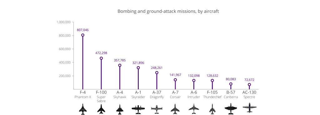 The data can be manipulated in a million different ways, and I had fight temptations to broaden the scope of the story map. Which branch of the U.S. military flew the most daytime ground-attack missions in Cambodia? Which U.S. Air Force unit dropped the greatest overall tonnage of bombs? What was the average duration of carrier-based U.S. Navy missions? Was napalm used more frequently in some countries than others? These are all questions that I mulled at some point or another, and that I knew the data could answer. But sometimes, less is more, and I knew that by only focusing on a few key aspects of the data, my story map would be more accessible to a general audience.