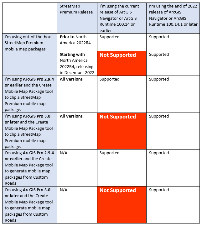 To ensure compatibility with the currently released versions of ArcGIS Navigator or ArcGIS Runtime 100.14 or earlier, you must use ArcGIS Pro 2.9.4 or earlier if you plan to make modifications to a StreetMap Premium mobile map package with the Create Mobile Map Package tool. If you make no changes to a StreetMap Premium mobile map packages, you should not be impacted.