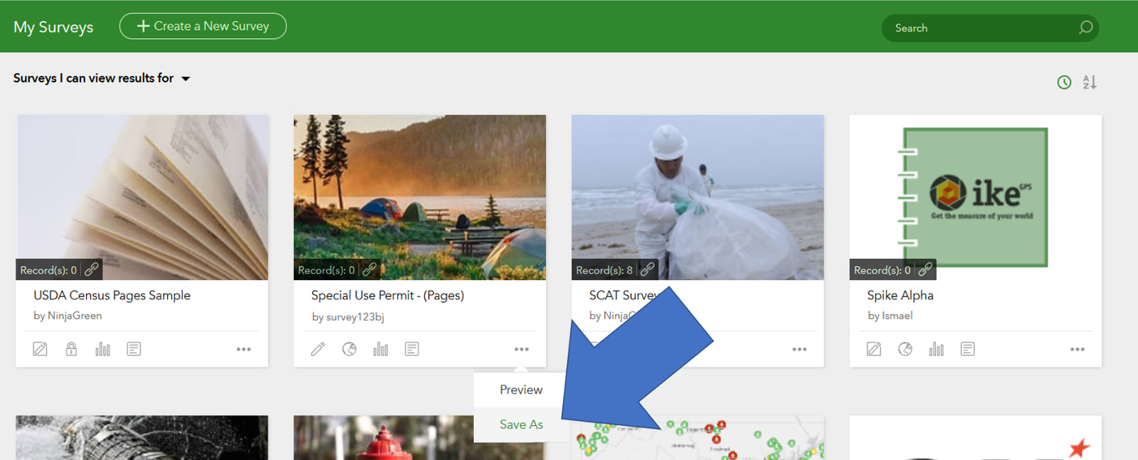 This is very handy if you want to clone survey designs within your ArcGIS organization. Create a survey first using Survey123 Designer, then share the survey with someone else by granting access through the Viewer group sharing settings in the Collaborate page. Next, have that second person login into the Survey123 website and show ‘Surveys I can view results for’ in the survey gallery. The Save As option will be available on the survey tile menu to clone the survey.