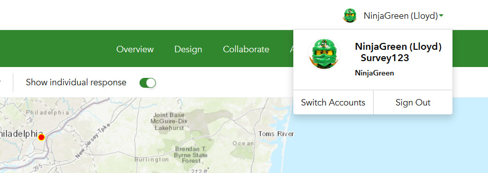 - You can now quickly switch between ArcGIS accounts in the Survey123 website without having to logout.
