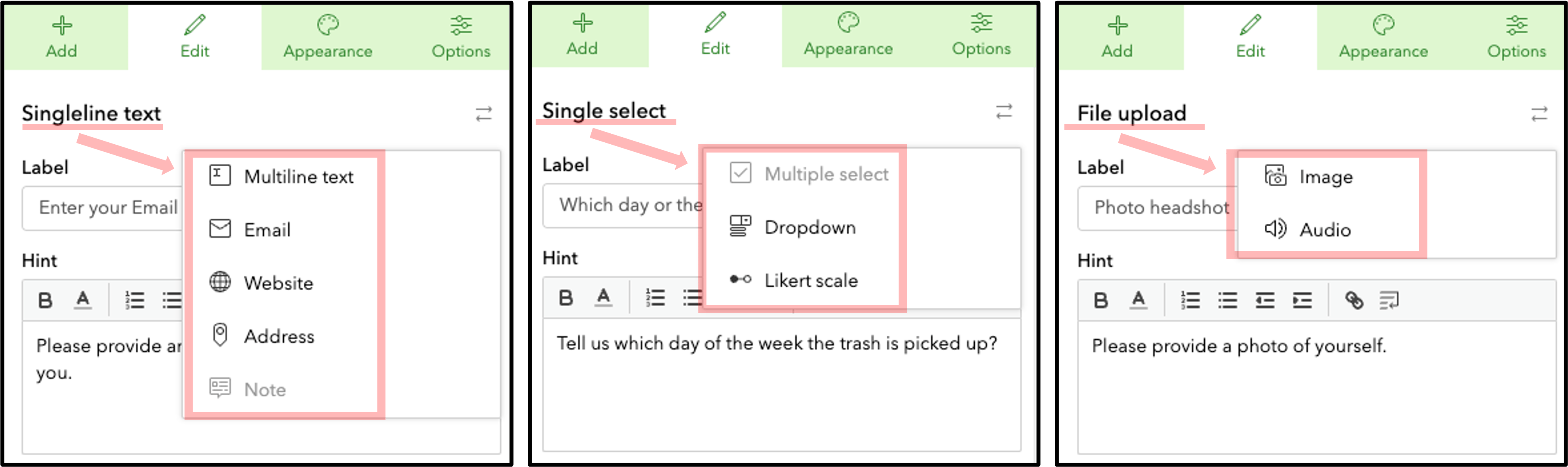 Have you ever built and published a Survey123 form only to wish later that you would have used a different question type as an input? Maybe you chose a Singleline text question but not regret not choosing an Email or Website question type. Or you would prefer to change a Single select question to a Dropdown question. Good news! The Survey123 web designer now allows you to change the question type of an existing question in your form. It’s important to note that not all question types are interchangeable, and you can only switch between question types if the underlying field type remains the same. The image below shows some of the options available for changing question types. For more information see Update a survey.