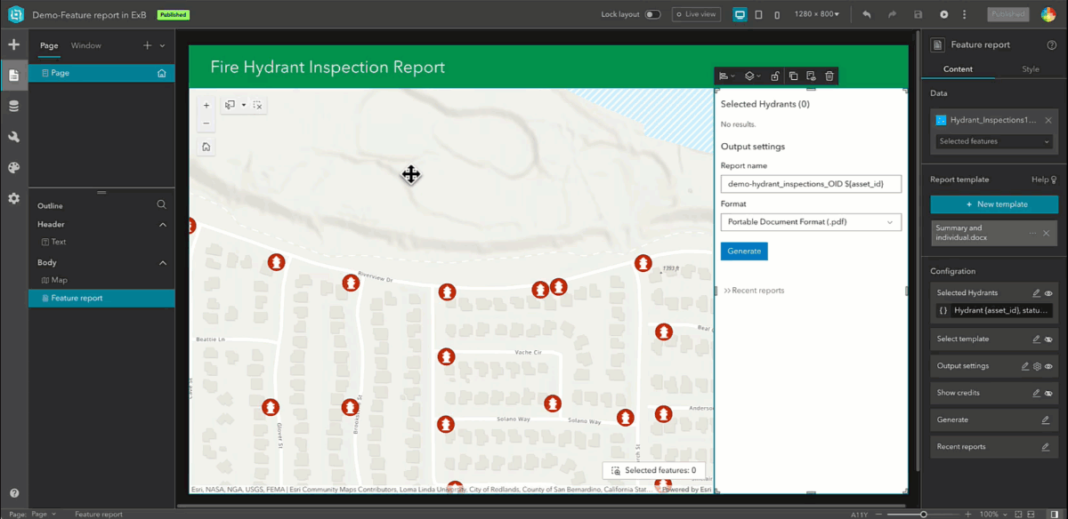 The following video demonstrates a fire hydrant report application in Experience Builder, which includes a Map widget and a Feature Report widget. Users can select multiple fire hydrants on the map to generate a summary report. Learn more about the Feature Report Widget in Experience Builder.