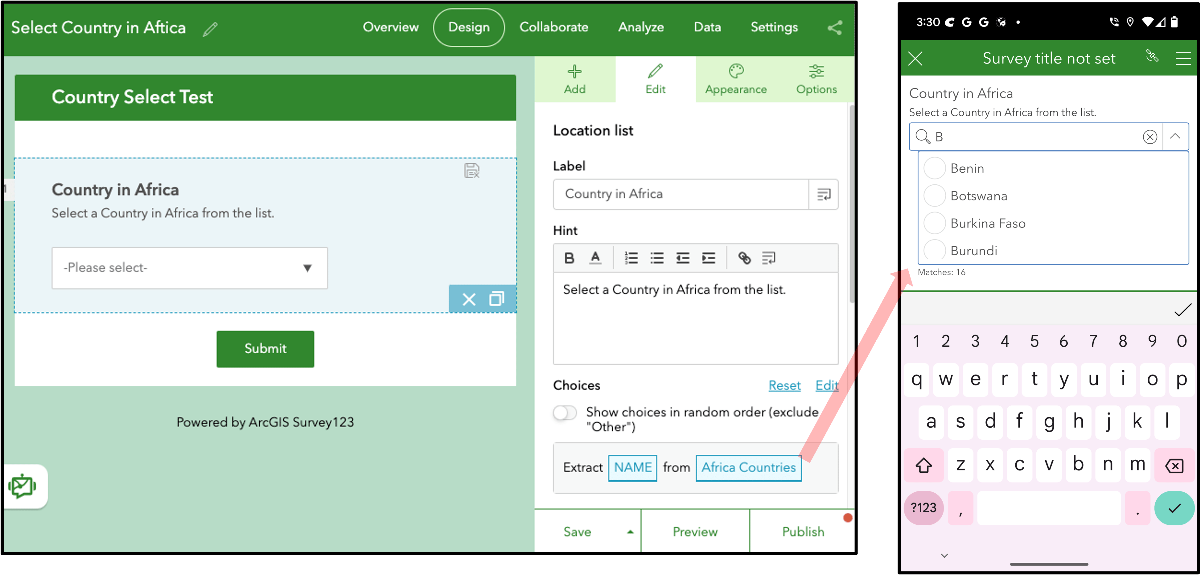 A fundamental aspect of Survey123 is its capability to incorporate location data within your digital forms. The Survey123 web designer gives you the option of capturing location information through a GNSS/GPS sensor, by specifying a location on a map or by inputting an address. However, there are situations where the location options are predetermined, necessitating that the end user simply selects a location from a pre-established list. An example could be completing a form for a census track, country, or store location. In this release the web designer now includes a new Location list question type.