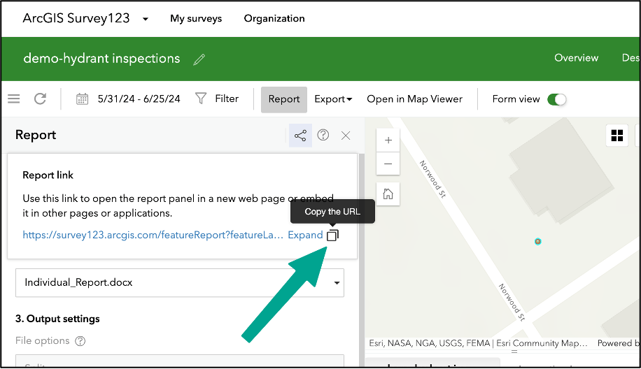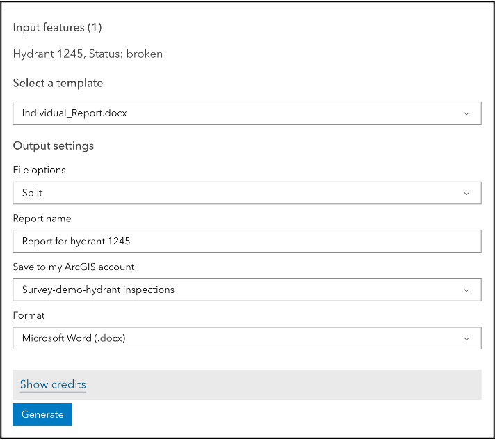 A key functionality of Survey123 is the ability to export survey feature data into custom reports in either PDF or Word formats through the use of report templates. Besides generating reports on the Data tab of the Survey123 website and the automation workflow; in this release, we are introducing a web page for the reporting capability. This update will be useful in scenarios such as: