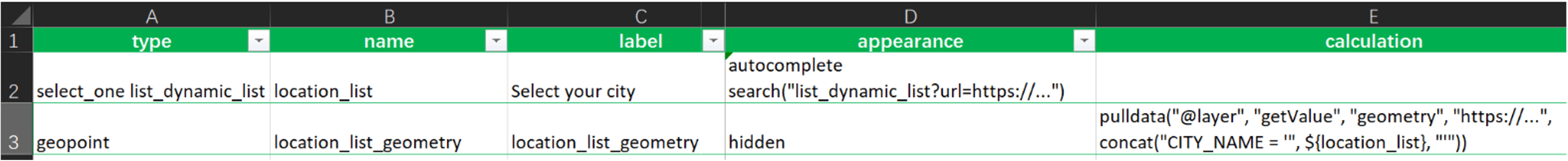 When authoring the Location list question in web designer, two questions are created in the behind xlsx form: a select_one question with the search appearance to populate the list, and a geopoint, geotrace or geoshape question with the pulldata(“@layer”) calculation to grab the geometry of a selected choice item: