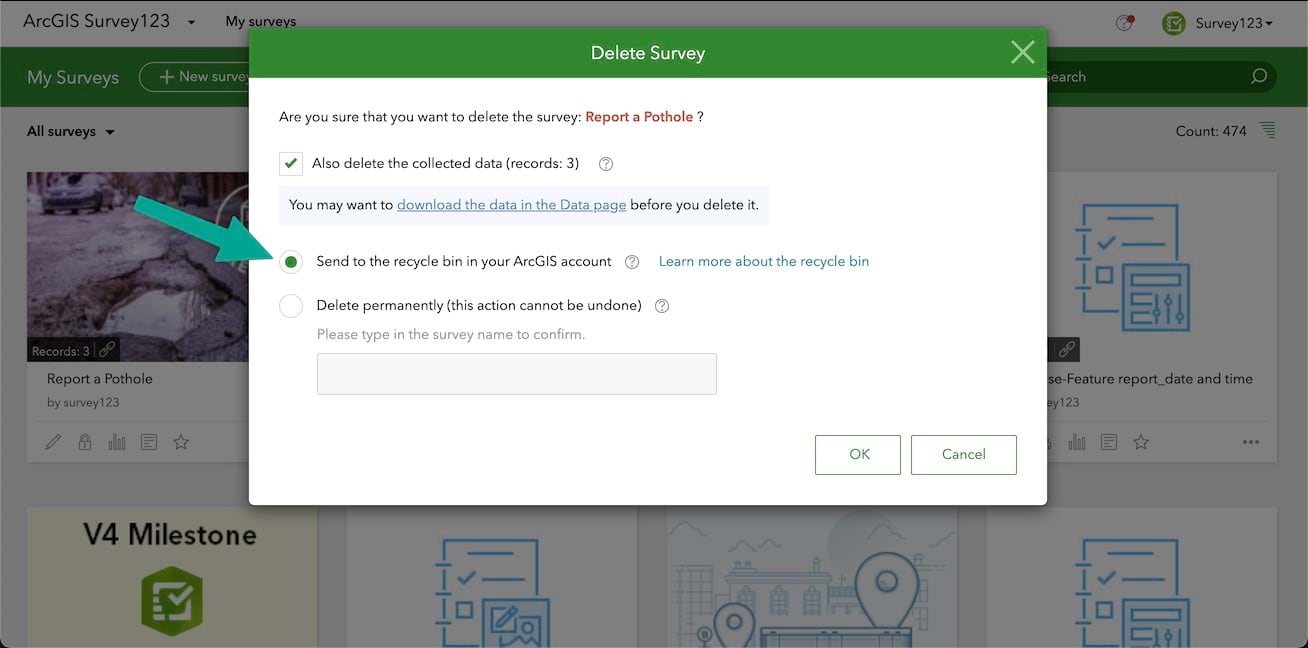 Once the recycle bin is activated in your ArcGIS Organization, you will see the option to “Send to the recycle bin in your ArcGIS account” in the delete survey dialog. This allows for easy recovery of surveys in the event of accidental deletion.