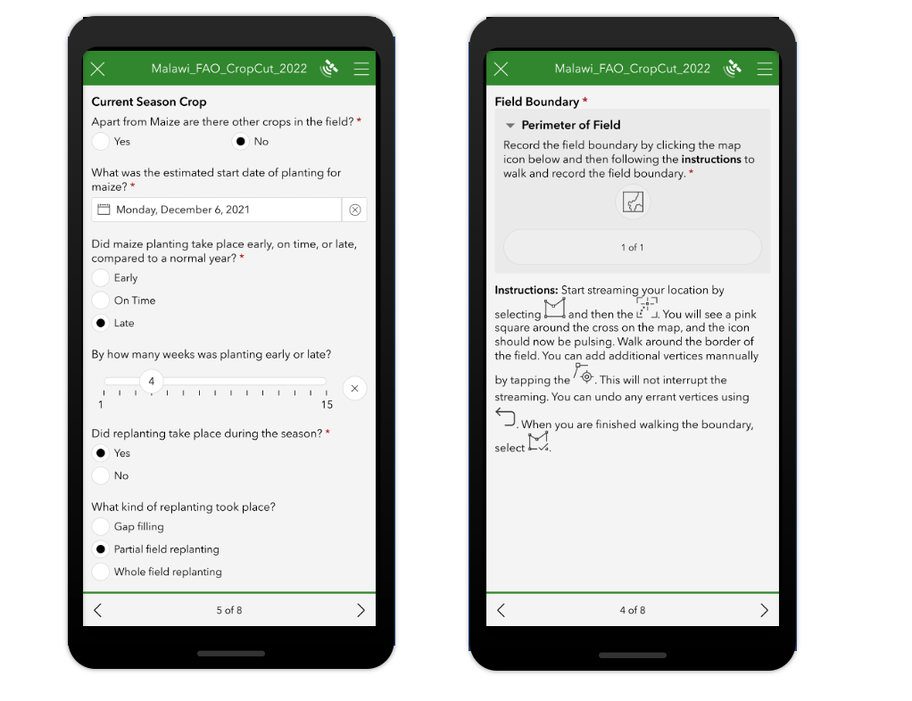 To address this data gap, NASA Harvest, in partnership with the United Nations Food and Agriculture Organization (UN FAO) Global Information and Early Warning Systems Network, tested methods for the collection of critical ground data for the development of cropland and croptype maps across pilot countries in sub-Saharan Africa. They used ArcGIS Survey123 to pilot an easier and more accurate way of obtaining ground truth data sets, covering cropland and croptype mapping needs and contributing to yield forecast estimation for complex small holder agricultural lands. With more ground data available, NASA Harvest can now validate its EO-based products and models with the aim of providing more reliable early warning systems to support food security decisions.