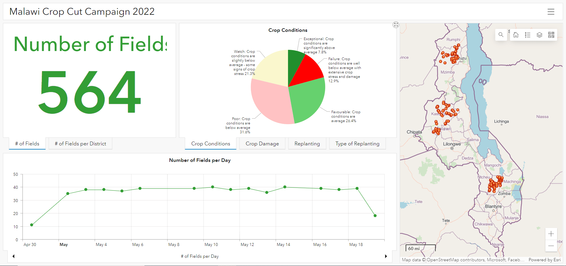 At the end of each day, they uploaded their data and everyone could monitor the progress of the campaign in an ArcGIS Dashboard. The Dashboard helped the team monitor the campaign progress providing analysis of the data as it came in. It allowed them to keep track of the information collected and campaign leads which helped to spatially understand the impact of pests, drought and even floods on farmers’ fields.