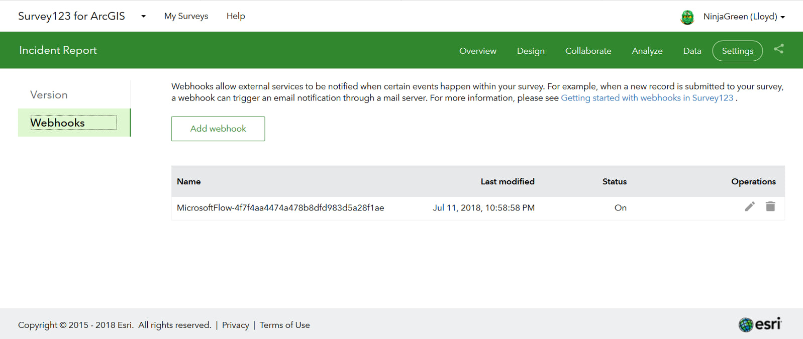A webhook is simply a URL Callback. That is, a URL that is invoked by an app when a particular event occurs, to pass some data to another app. In our case, the apps are Survey123, which invokes the URL, and Microsoft Flow, which is the receiver of the webhook.