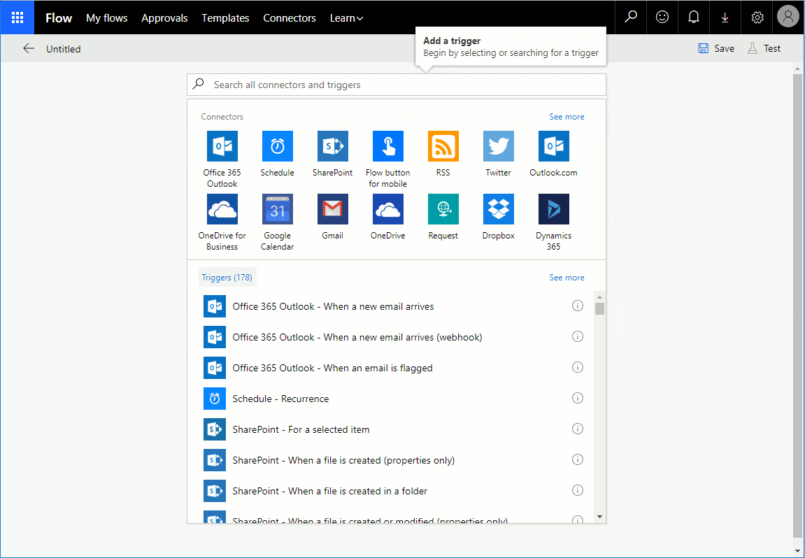 Within Microsoft Flow, go into My flows and select Create from blank. This will present a gallery of Connectors, from which you will be able to trigger your Flow.