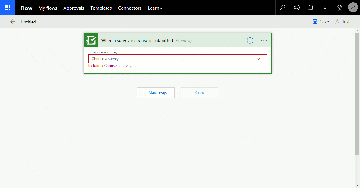 The very first step in every flow you create is to define a trigger. Search for Survey123 in the gallery of connectors. You will notice that Microsoft Flow includes many connectors out of the box. That is the beauty of it!