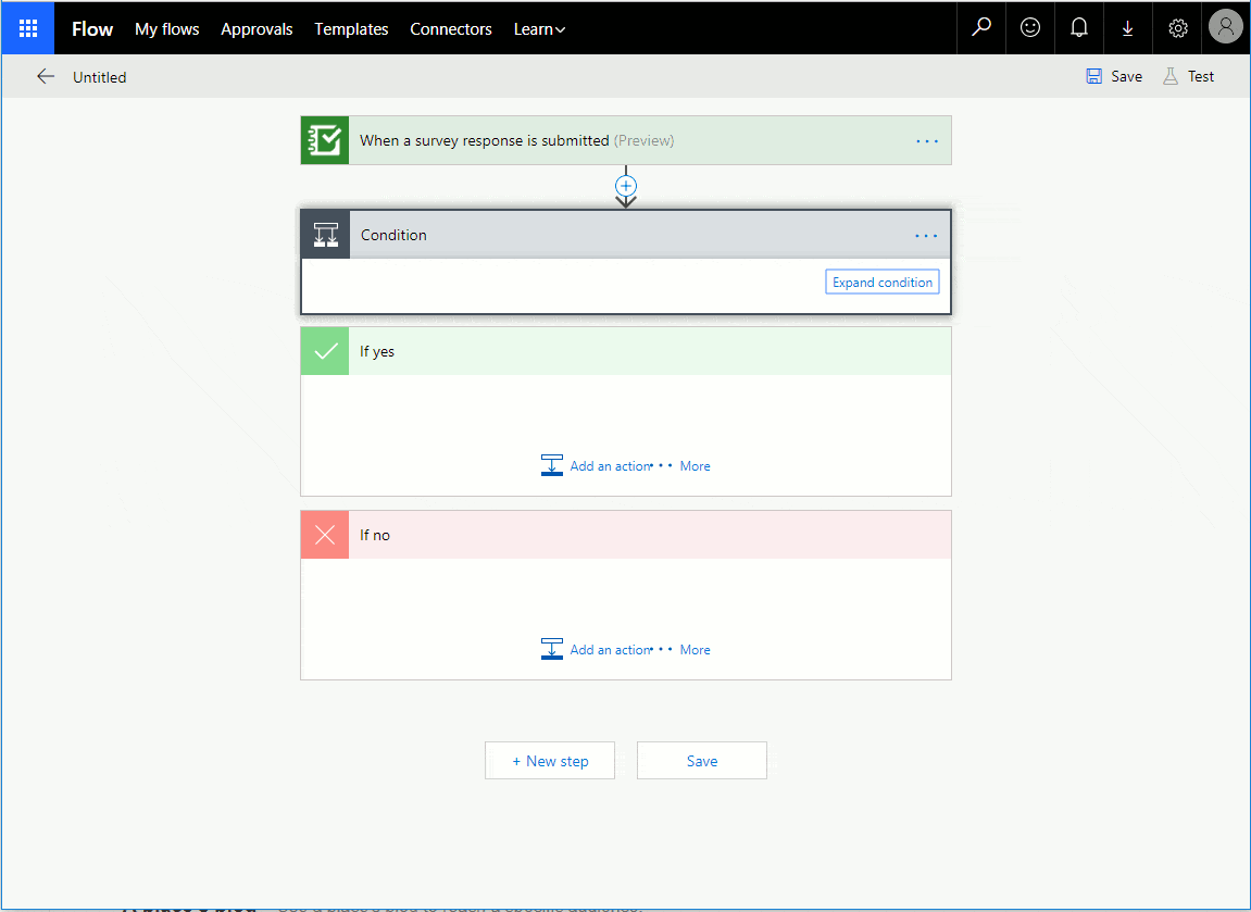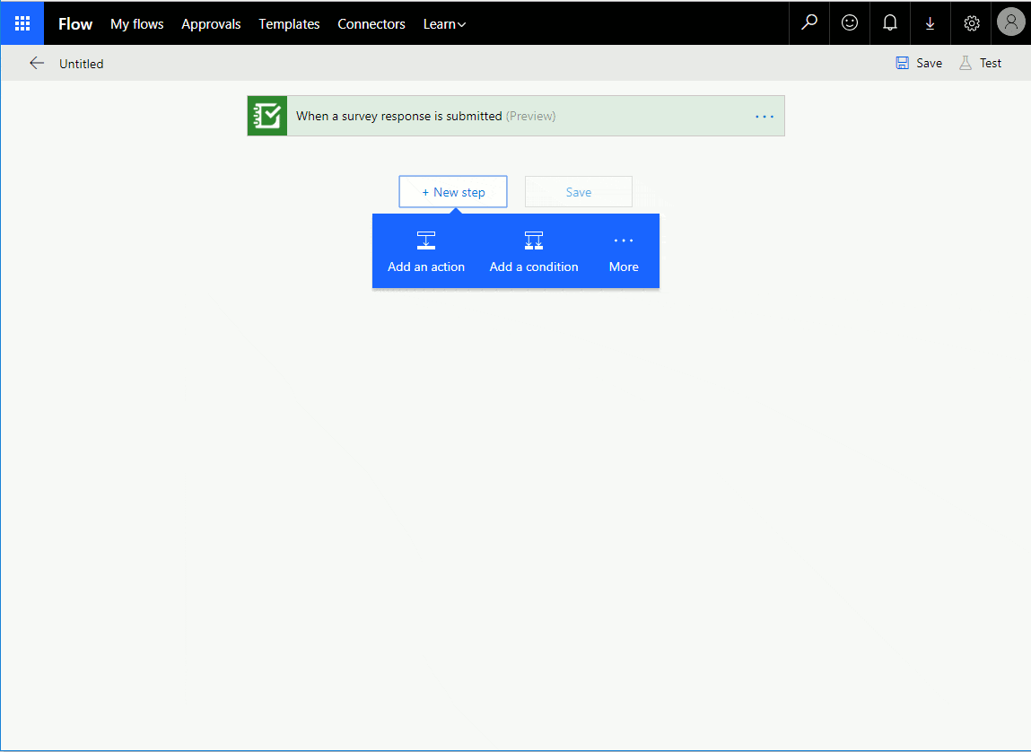 Once your survey trigger is set, you can start adding conditions, actions and loop statements to your flow. In this example I will add a condition to check if the value of the Priority question in the survey response is equal to High.