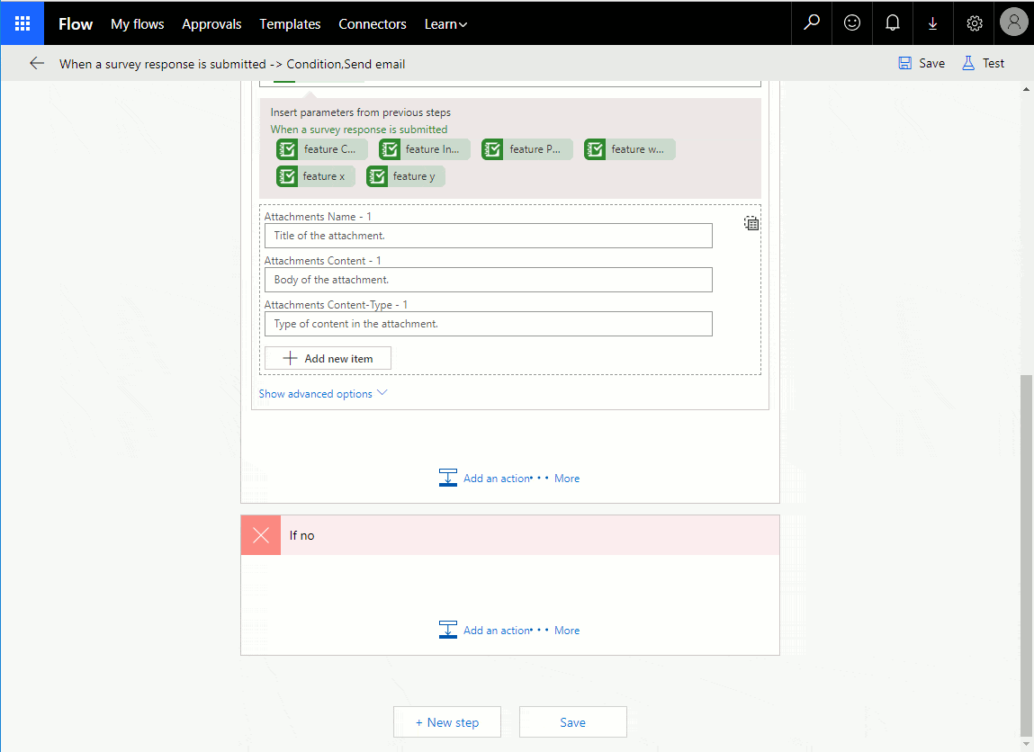 One of the great features in Microsoft Flow is that you can process incoming data submitted through your survey response. For example, in the scenario above I processed the values in the Priority question to build a condition. I also used the values in the Comment and Location question for the subject of the e-mail.