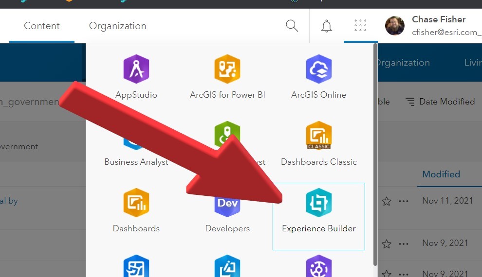 - First, open ArcGIS Experience Builder from your ArcGIS Online or ArcGIS Enterprise Org app launcher.