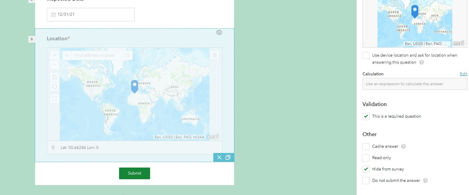 If you are submitting a new survey and just passing through information from the map feature… You may want the x,y of the selected location to be the x,y of your new survey point…. For this to happen there is one thing you must do. You will need to add a map question to your survey123, you can hide that question from the survey so as to not to confuse the submitter.