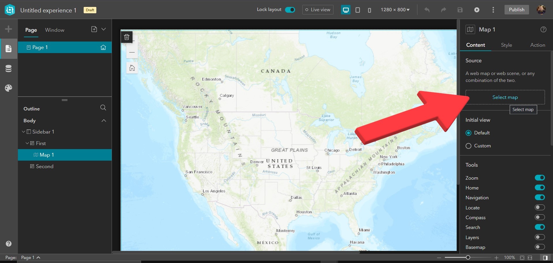4. Now select the map in the center of the screen. In the dialog box on the right, click on “Select map“