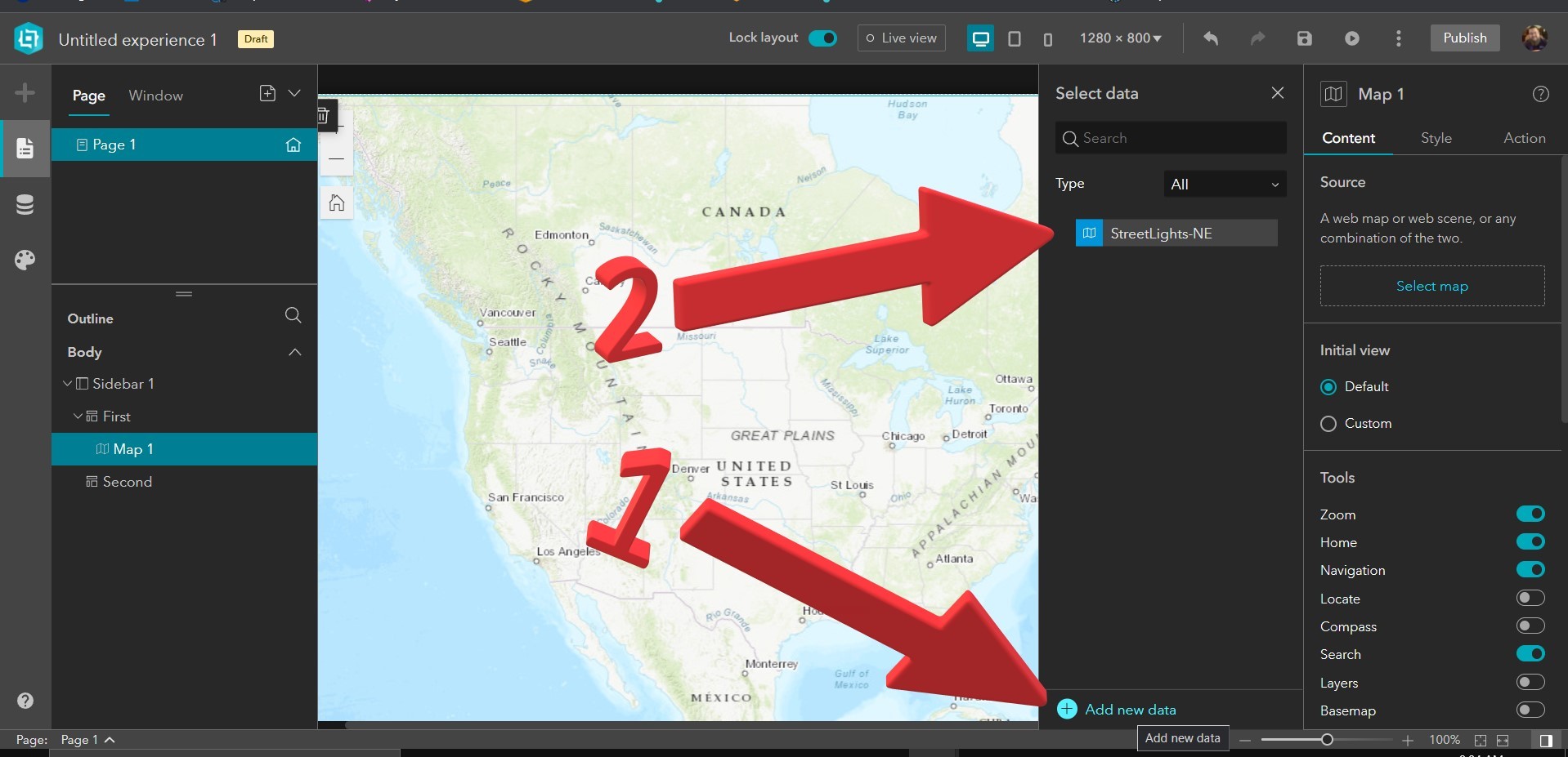 5. In an Experience Builder App you must add data you want to work with. First, click on “Add new data” at the bottom, and then once you select the map you want to work with it will come up on your list. Now select the map you chose to replace the default map.