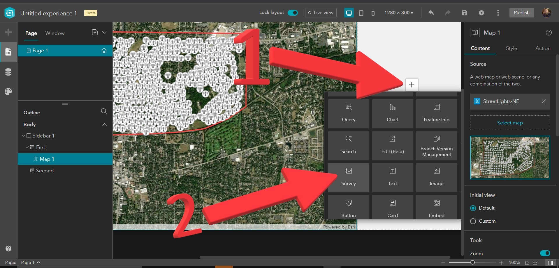 Now that we have made our Experience Builder Application, let’s configure it. We need to select a new map. Let’s change the default map to a map you have that either contains the Survey123 Data you want to edit or has data in it you would like to pass on to Survey123.