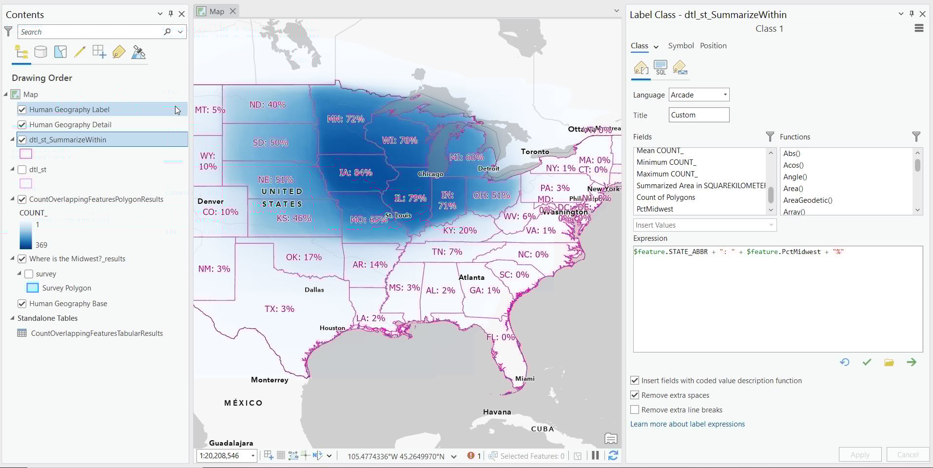 In order to get percentages for each state about perceptions of whether or not they are in the Midwest, we added states as layer from ArcGIS Living Atlas. From there, we ran the Summarize Within geoprocessing tool. This generates a new states layer with additional fields containing summary statistics of the Count Overlapping Features results. We chose to run the mean, min, and max, which yielded three additional fields.