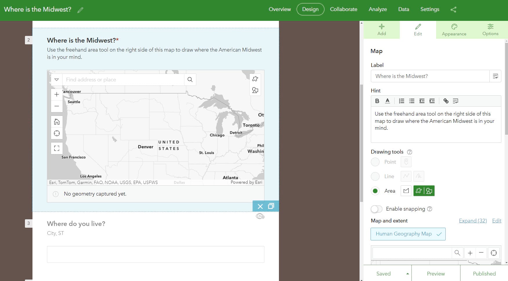 ArcGIS Survey123 can be configured to allow your respondents to capture a polygon that they draw. When designing a survey, add a Map survey item. The label and hint allow you to add text that will be displayed to your respondents as they take the survey. Next, choose the appropriate Drawing Tools: point, line, or area. In our case, we chose area since we wanted to gather polygons. Choose an appropriate basemap for your map. The Human Geography works well since it is a neutral-colored, distraction-free basemap subtle with state lines and rivers, that can help orient your respondents so they can provide more precise locations when completing the survey.