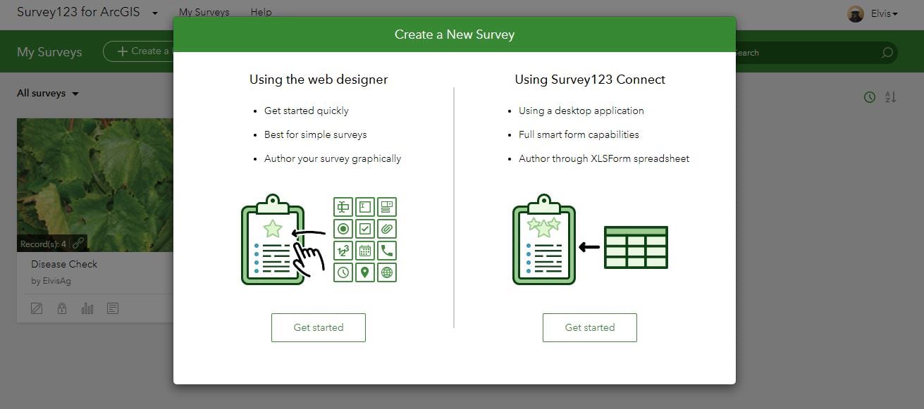 You can immediately begin to design a survey form by clicking on ‘Create a New Survey’. The web designer is the easiest way to build forms for data capture however you can use a desktop tool called Survey123 Connect that helps you build more advanced surveys. Our focus in this blog will be on Survey123 Connect.