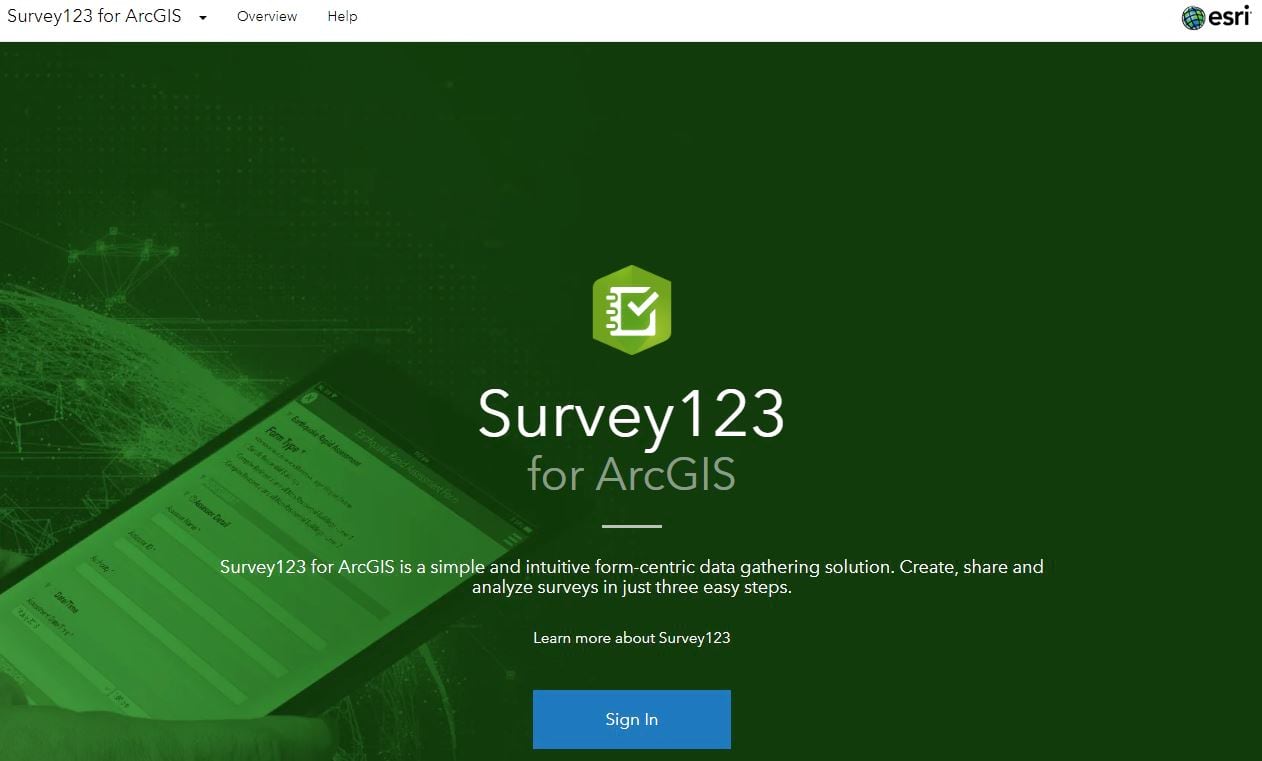 To get started, first download and install Survey123 for ArcGIS on your preferred device by going to survey123.arcgis.com and log in using your ArcGIS Online credentials. If you have any existing surveys they will be available for editing or for analysis of the previously captured data.