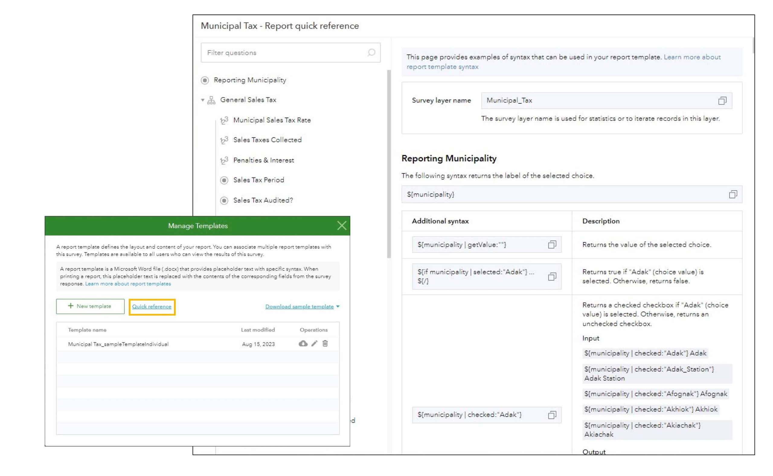 The first resource for getting started with building a template is the quick reference. This option provides examples and descriptions for various methods and parameters that can be used for each question in your survey.