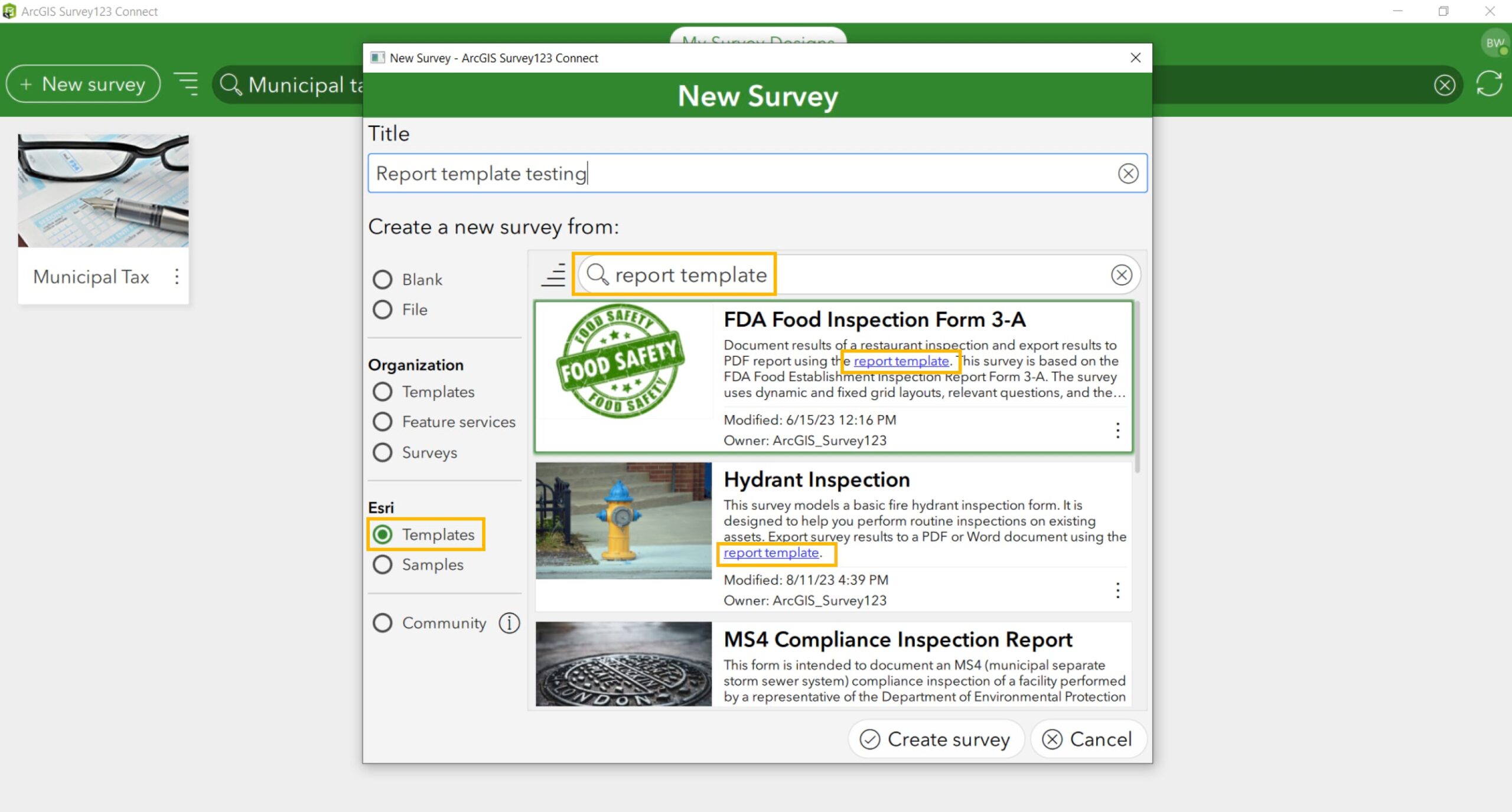 If you’d like to see examples of completed report templates, some of the Esri templates available in Survey123 Connect include report templates that can be used with the samples. You can find these by opening Connect, clicking Esri Templates, and searching for “report template”. The survey template description includes a hyperlink to the report template.