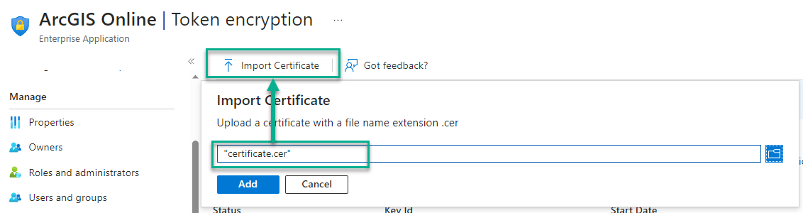 - Upload (and activate) the extracted certificate to the “Encryption” feature of the Enterprise (SAML) Identity Provider > ArcGIS Online App entry. Refer to your Enterprise Identity Provider’s documentation for specific instructions on this workflow.