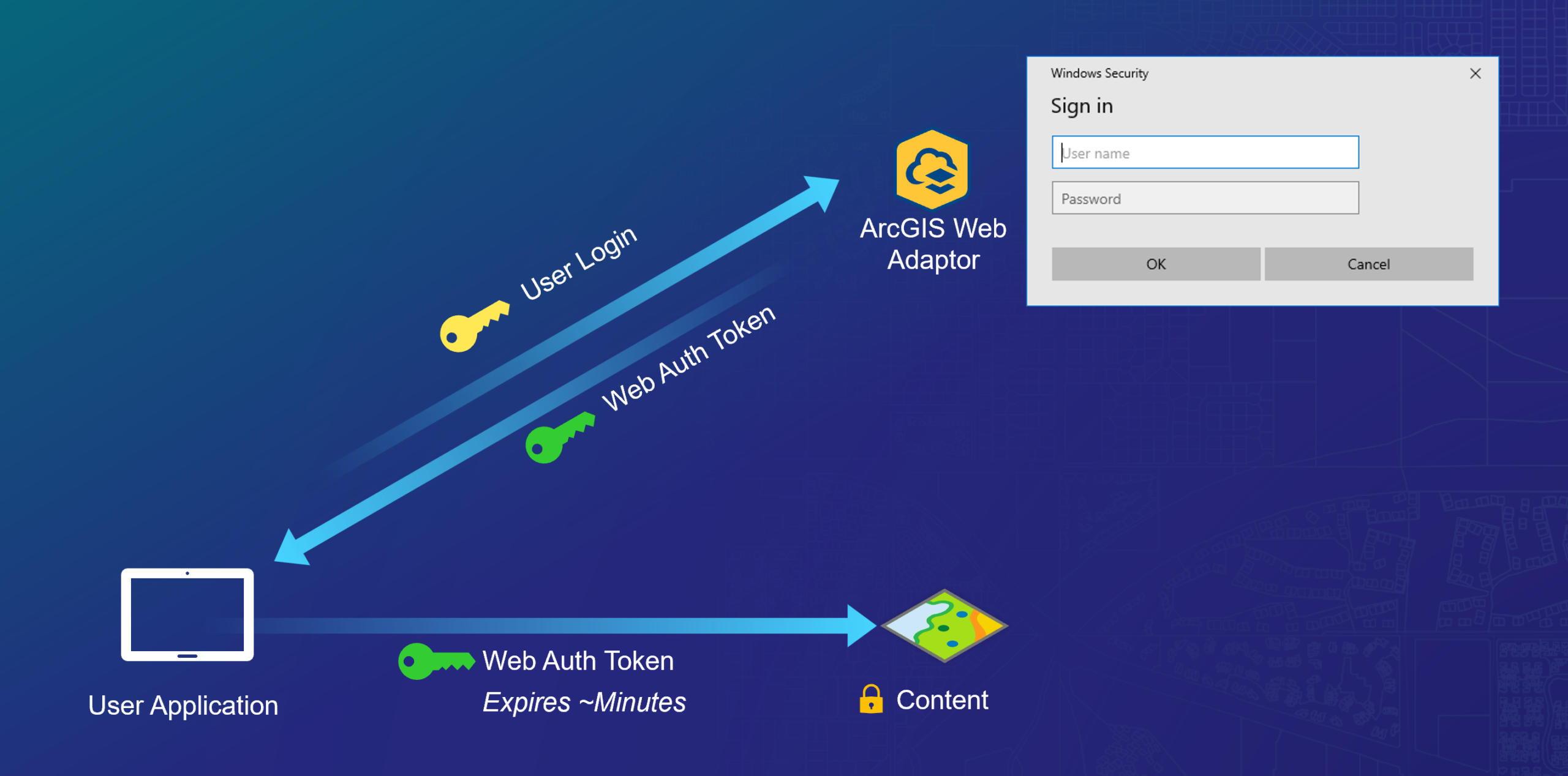 Web Tier Authentication makes use of thick client / web server authentication features (such as Windows Integrated Authentication) to perform an authentication handshake between the client (e.g. web browser) and the service. This flow requires the use of the ArcGIS Web Adaptor and deployed on a .NET Application Server (e.g IIS) or Java Application Server (e.g. Tomcat) and is suited to increasingly niche use cases where all user identities exist exclusively within the scope of an enterprise identity management platform integrated with the web server. Web Tier Authentication is a highly opinionated implementation option, offering little to no room for developer customization. These guardrails reduce implementation risks because sensitive features such as secrets handling are held outside the scope of what the application itself needs to process or handle.