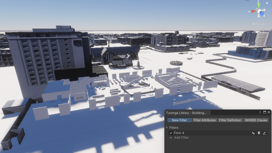 Opened in October 2018 and covering approximately 10,000 square meters over 5 floors, the Turanga Central Library in Christchurch, New Zealand is a good example of a complex, modern structure digitally designed and recorded in great detail. It has been published as a building scene layer, derived from an original Revit Model by Christchurch City Council, enabling us to use the new tools in the latest release of the Maps SDK for Unity to explore the building. For example, by filtering out the primary aspects within the architectural discipline such as the walls, floors, ceiling, and roofs we can show all the interior aspects and various adornments.