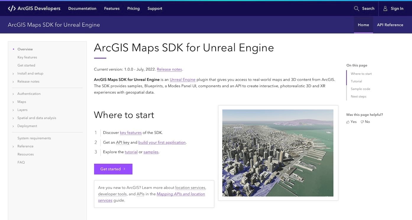 ArcGIS Maps SDK for Unreal Engine is more than just the API that you integrate into your project. It includes a comprehensive conceptual guide and API reference, tutorials, and an open source repository of samples to help you get started.