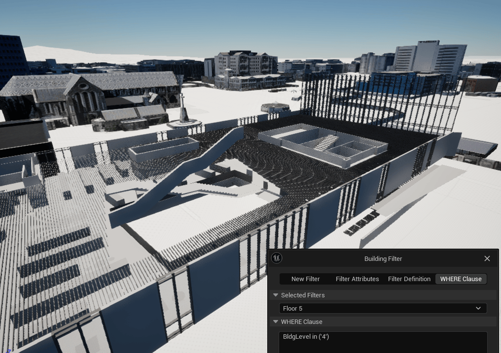 Opened in October 2018 and covering approximately 10,000 square meters over 5 floors, the Turanga Central Library in Christchurch, New Zealand is a good example of a complex, modern structure digitally designed and recorded in great detail. It has been published as a building scene layer, derived from an original Revit Model by Christchurch City Council, enabling us to use the new tools in the latest release of the Maps SDK for Unreal Engine to explore the building. For example, by filtering out the primary aspects within the architectural discipline such as the walls, floors, ceiling, and roofs we can show all the interior aspects and various adornments.