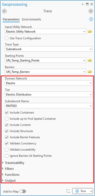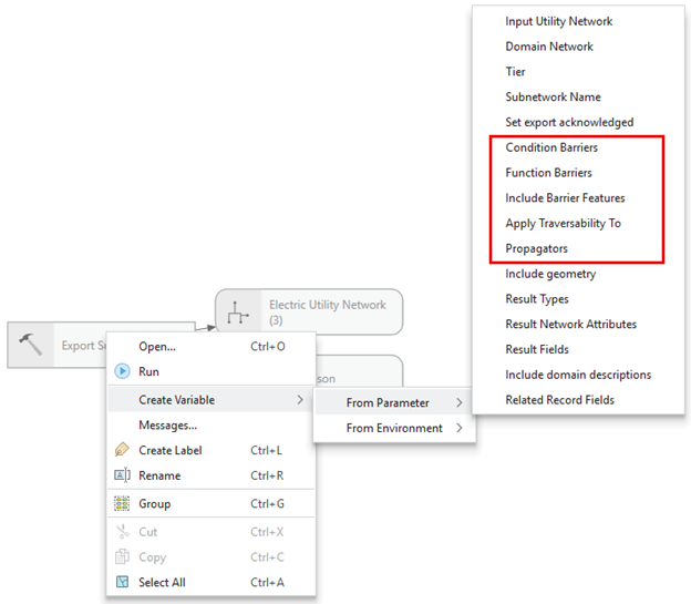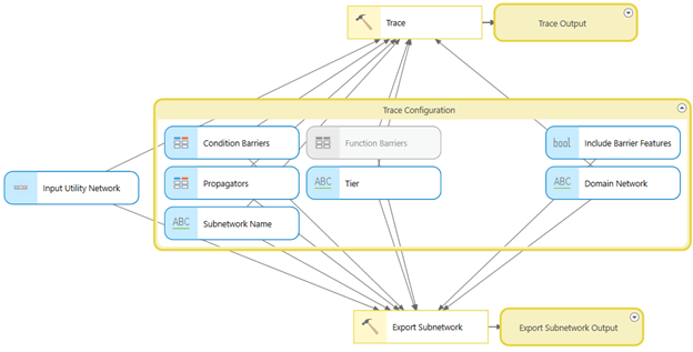 If you create a new model and add the Export Subnetwork geoprocessing tool to it, you will see that the interface for the tool appears the same. However, if you right-click the tool you will see a context menu that lets you Create Variables from the parameters of this tool. If you expand the parameter list, you will see that the tool has several hidden parameters available that correspond to the trace configuration.