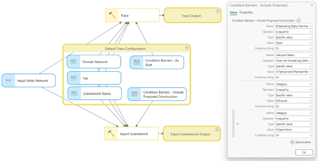 Back to our example from the Design to operations article. The workflow described in that article allows you to extract proposed, currently de-energized features. This is achieved by using a different set of condition barriers for each trace.
