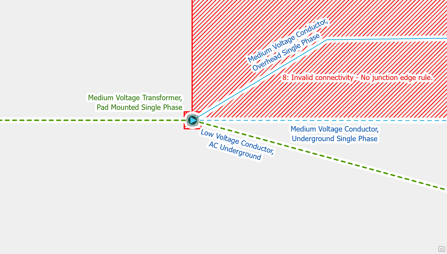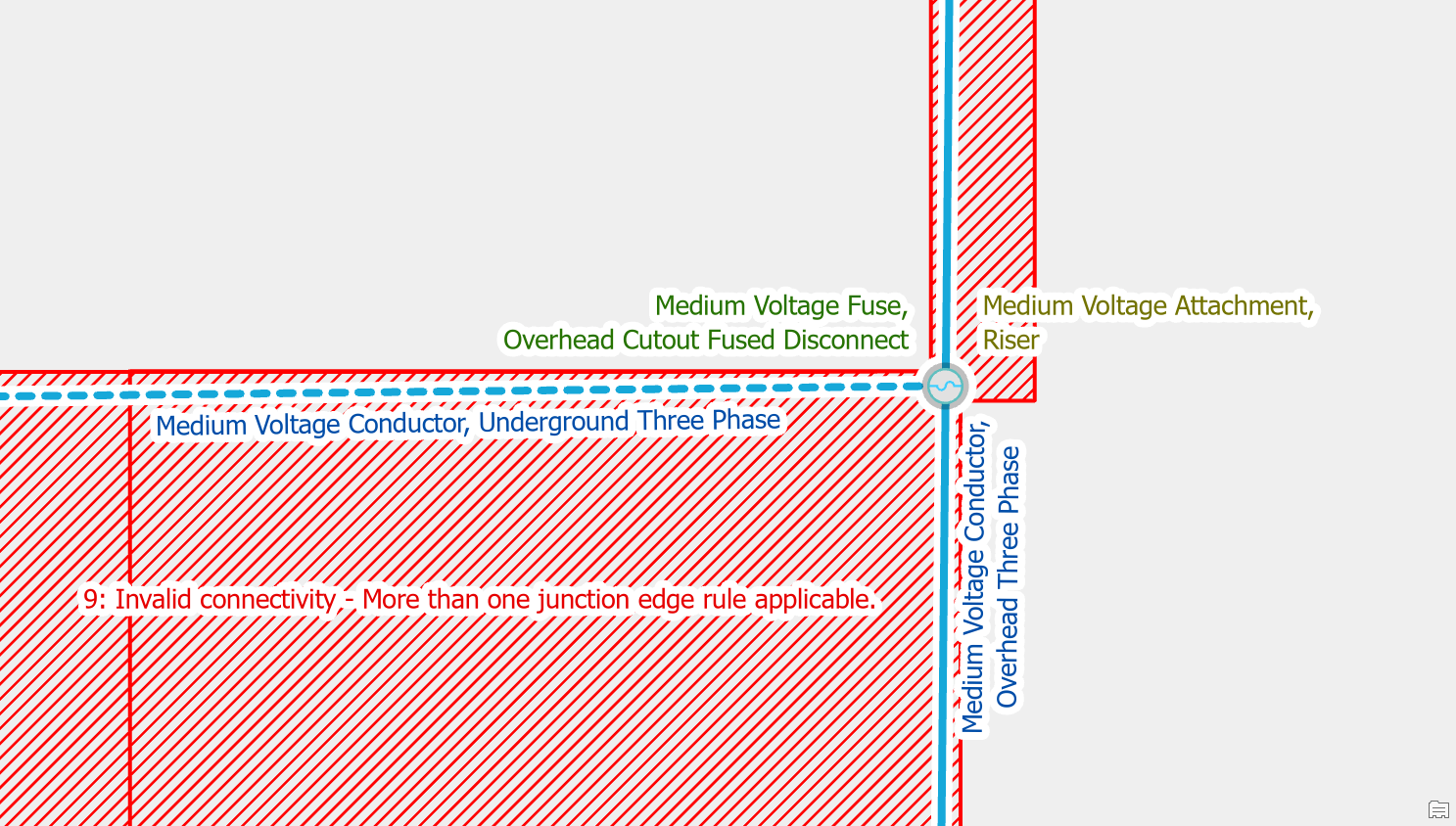 If you have an overhead conductor connected directly to an underground conductor without a device or junction then you will also receive an error. You can clear the error by creating a riser between the lines. You should then get a crew to verify whether there is also some kind of device at the location like a fuse or disconnect switch, especially if the line is part of the backbone of the circuit.