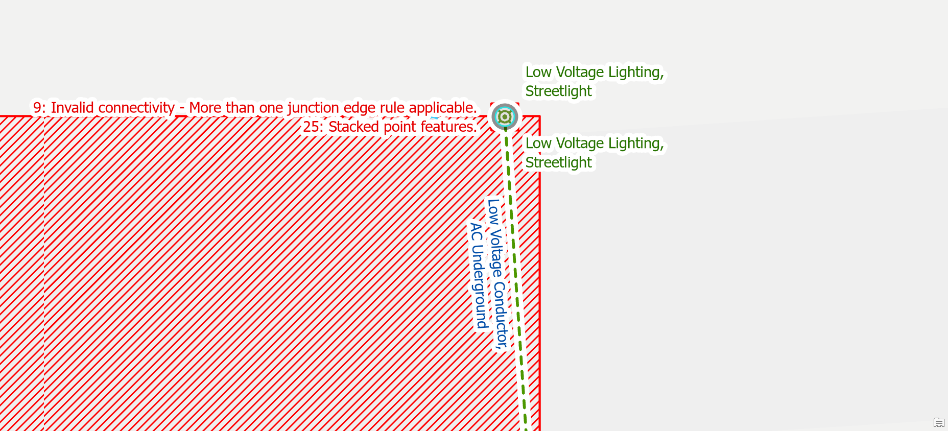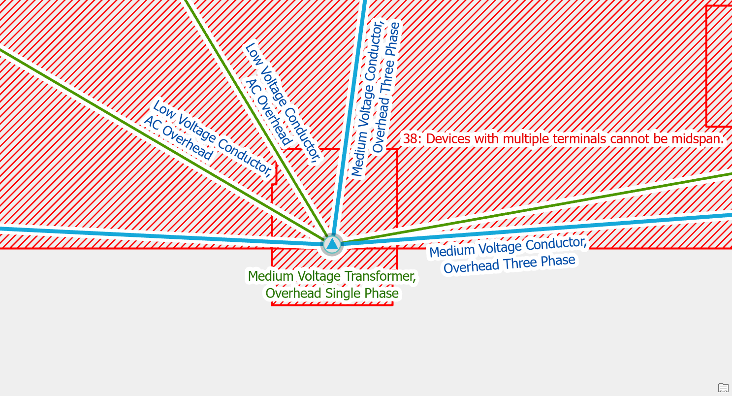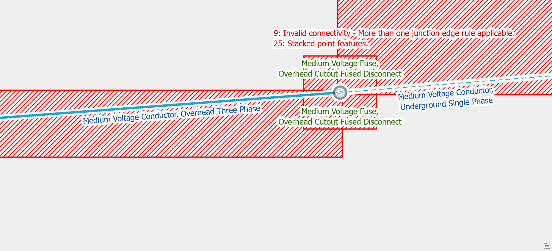 If you have two valid point features that are connected to a line, but the features happen to be stacked on top of each other, you will need to move one of these features. A common example of this is when placing a riser and a fuse on the same pole. To correct the error you will want to move the riser off the pole.