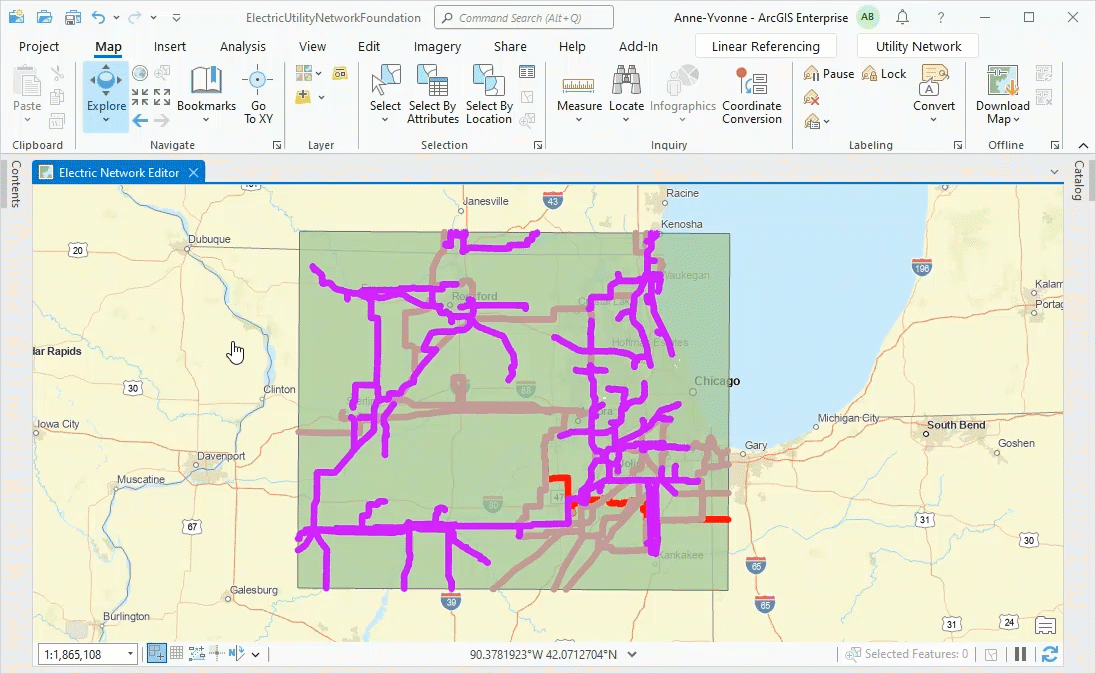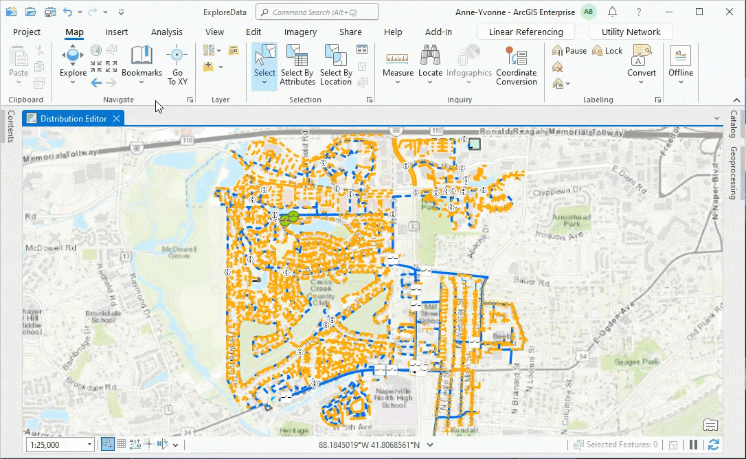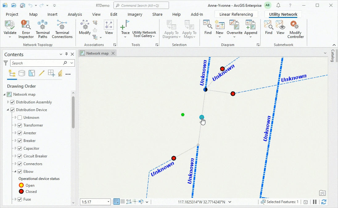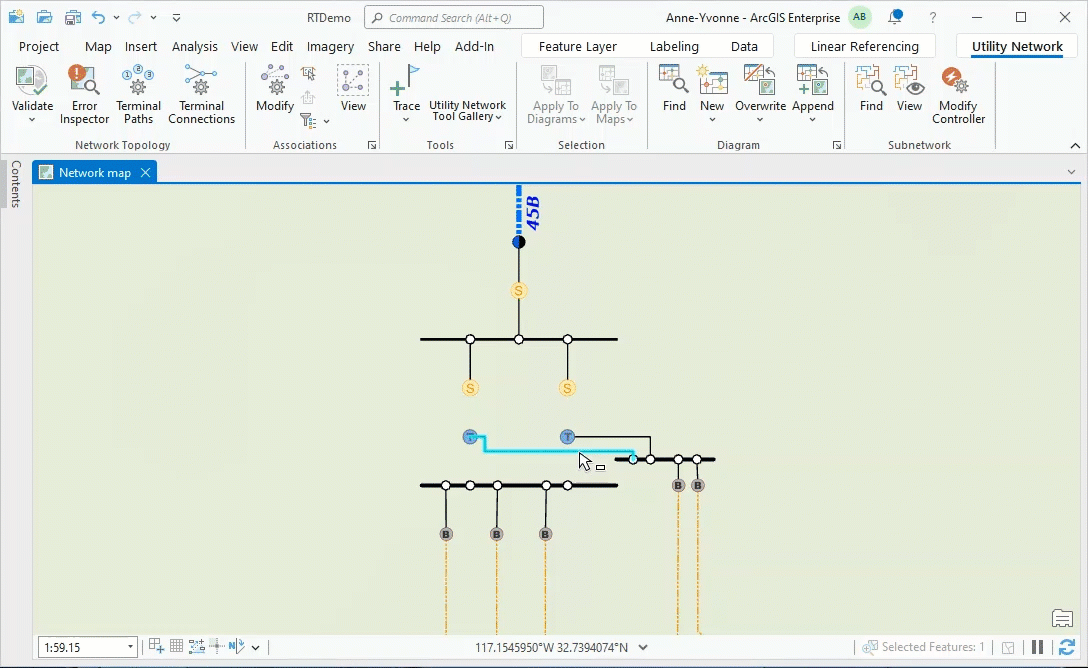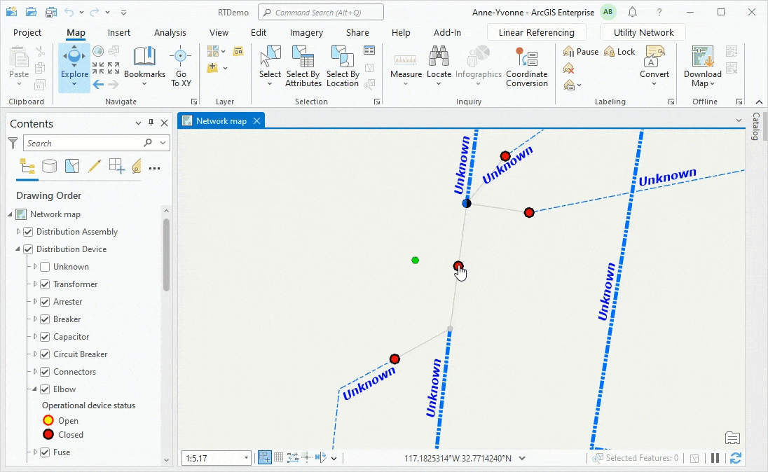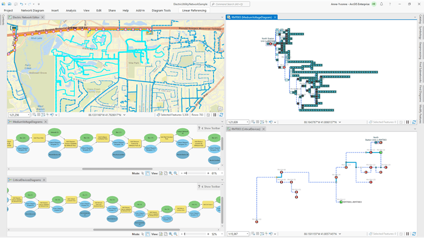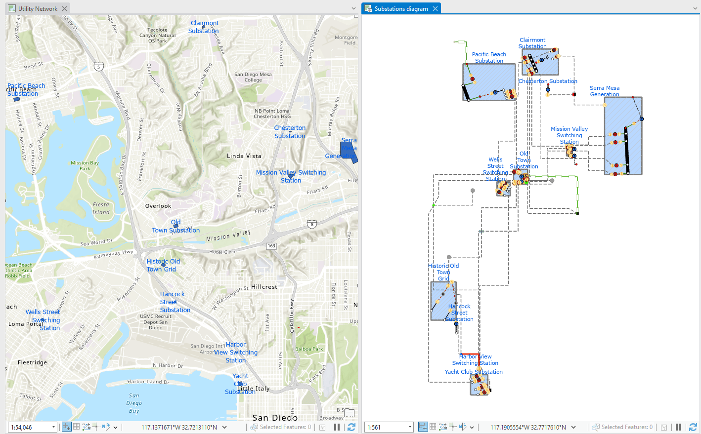 In the side-by-side views there is no scale difference between the diagram and network maps. However, since the diagram focuses primarily on the critical devices along each distribution subnetwork, there are only about 300 diagram features. This allows for a synthetic visualization showing critical devices that are well organized and related. Bringing it full circle, this is a simplified approach to managing switching operations on critical devices from diagram to map view.