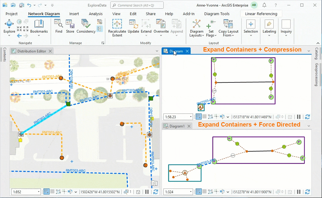 In data quality control and assurance workflows, specific settings on the diagram template are used to build them, which helps visualize and check network connectivity or containment associations faster. It is made faster because you use diagram rules configured on your diagram template to highlight existing or missing relations between network features. For example, you can highlight connectivity associations or structural attachments as part of the diagram template. Additionally, we can identify existing or missing features by systematically expanding network containers in the diagrams. Automatic diagram layouts can complete the template configuration and be set up to spread overlapping features consistently. This allows users to verify how network elements are connected in one glance.