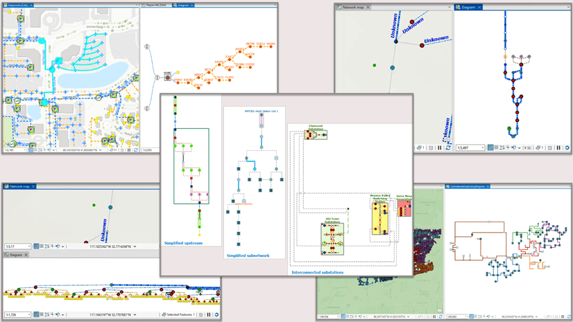 Aside from checking network data, diagrams can be used when we need to produce very detailed visualizations like a CAD drawing. When working in your geographic or network map, you may have map scale constraints preventing you from visualizing specific network features simultaneously and in detail. We can remove the need to zoom to a particular scale repeatedly. For example, let’s say we want to see everything inside the several substations far apart from each other. So, instead of zooming to each substation, we can use a diagram to visualize the content.