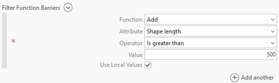 A filter function barrier is best used with an upstream or downstream trace to identify the upstream or downstream features of the start point. The filter function barrier allows the source or sinks to be located, then limits the resulting features to meet the criteria you specified, such as stopping after a certain distance has been travelled.