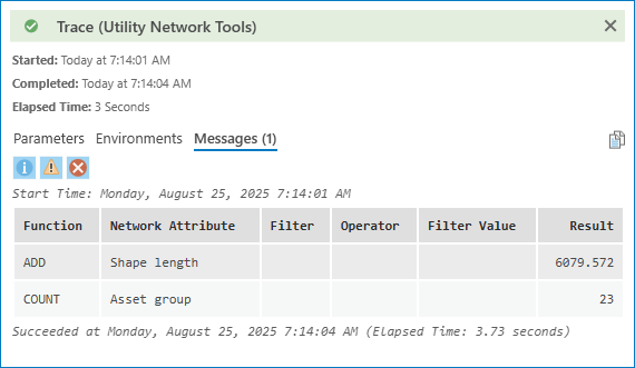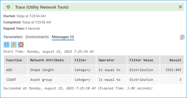 A function will apply a calculation to all the features returned by the trace and display them in the trace results. The Add function will add the Shape Length values for all the features in the results, giving us the total length of all the lines in the trace. The Count function will count how many features are in the path by relying on the fact that every network feature has an asset group that can be counted.