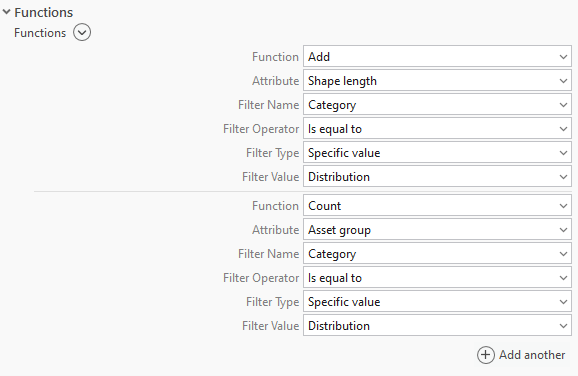 In that case we could use the filtering fields for each function to only calculate values that meet the filter criteria. In the example below we added a filter for features that have a custom network category called Distribution assigned to them.