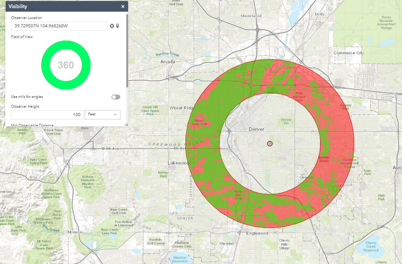 The second widget we added is the Visibility widget. This widget helps you create a Radial Line of Sight (RLOS) analysis by determining what is visible from an observer location based on a given distance, height and a field of view.
