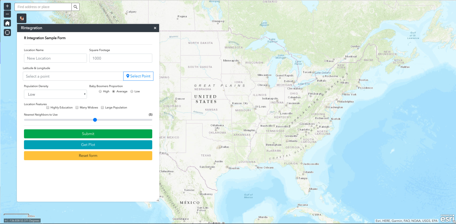 To solve the challenge of delivering a complex and computationally intensive predictive model to non-technical users, Retail Scientifics has developed an easy to use web-based front-end built on Web AppBuilder, which calls a cloud-based API that references R code for the model. Once a model is constructed and properly calibrated by a skilled data scientist, this approach allows the model to be leveraged by a broad range of users through a simple form interface.