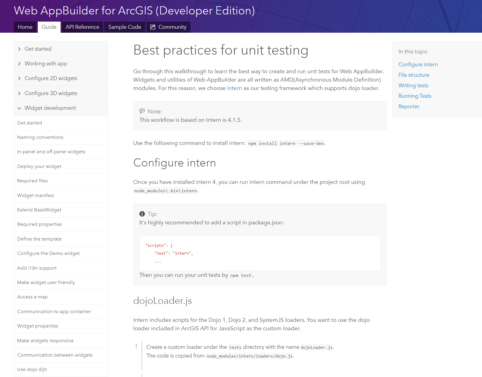 We have also made some additional enhancements to the documentation, specifically on unit testing. Unit testing is one of those things we should always do, but sometimes most of us don’t. Now there are no more excuses not to do it with Web AppBuilder, as it provides a detailed walk through on how to run unit tests on your widgets and themes.