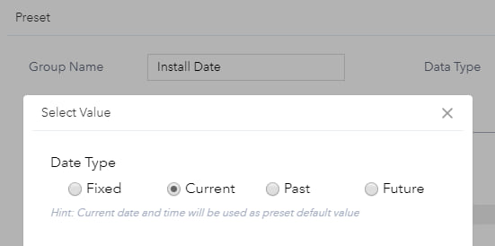 A common request we received for the Smart Editor widget is to support relative dates for preset values. In this way, a field inspection worker, for example, no longer needs to manually enter the inspection date for every property they inspect. Now you can select between Current, Past, Future, or Fixed date types on the Preset dialog box which is a new preset builder to streamline your workflow under the Attribute Actions tab.