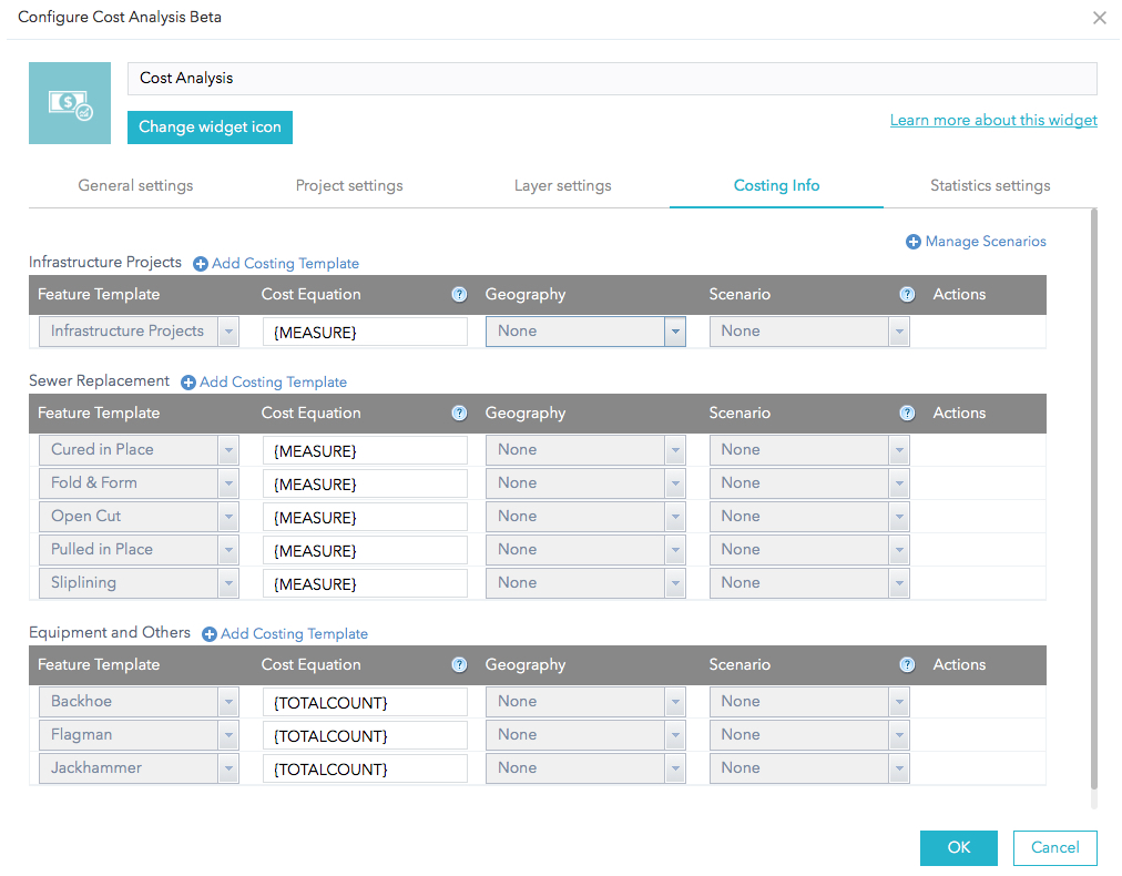 Because the Cost Analysis Widget was generically designed for any type of asset that can be represented as a point, line or polygon and you will need to configure it for the assets that you want need to estimate costs for and their associated cost factors.